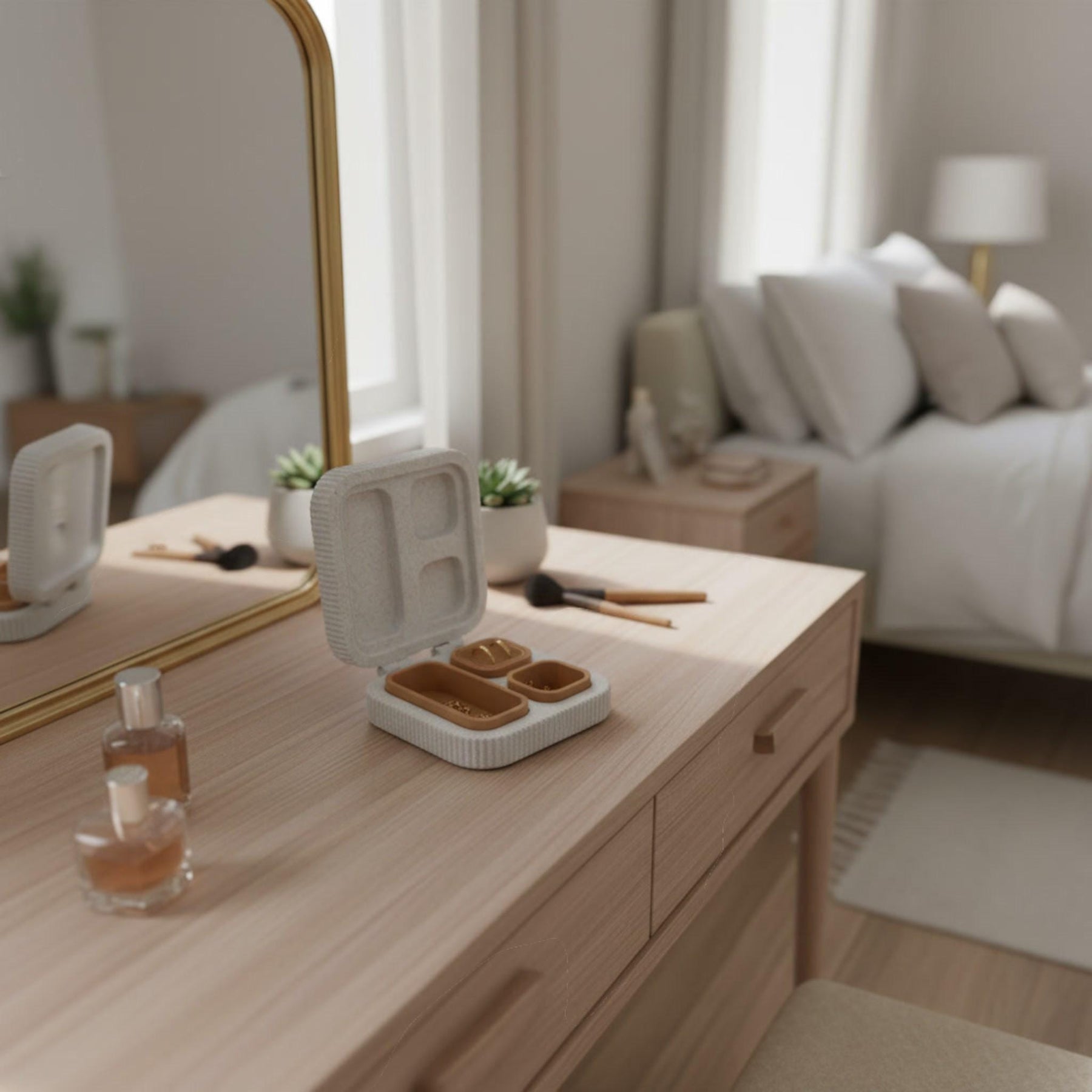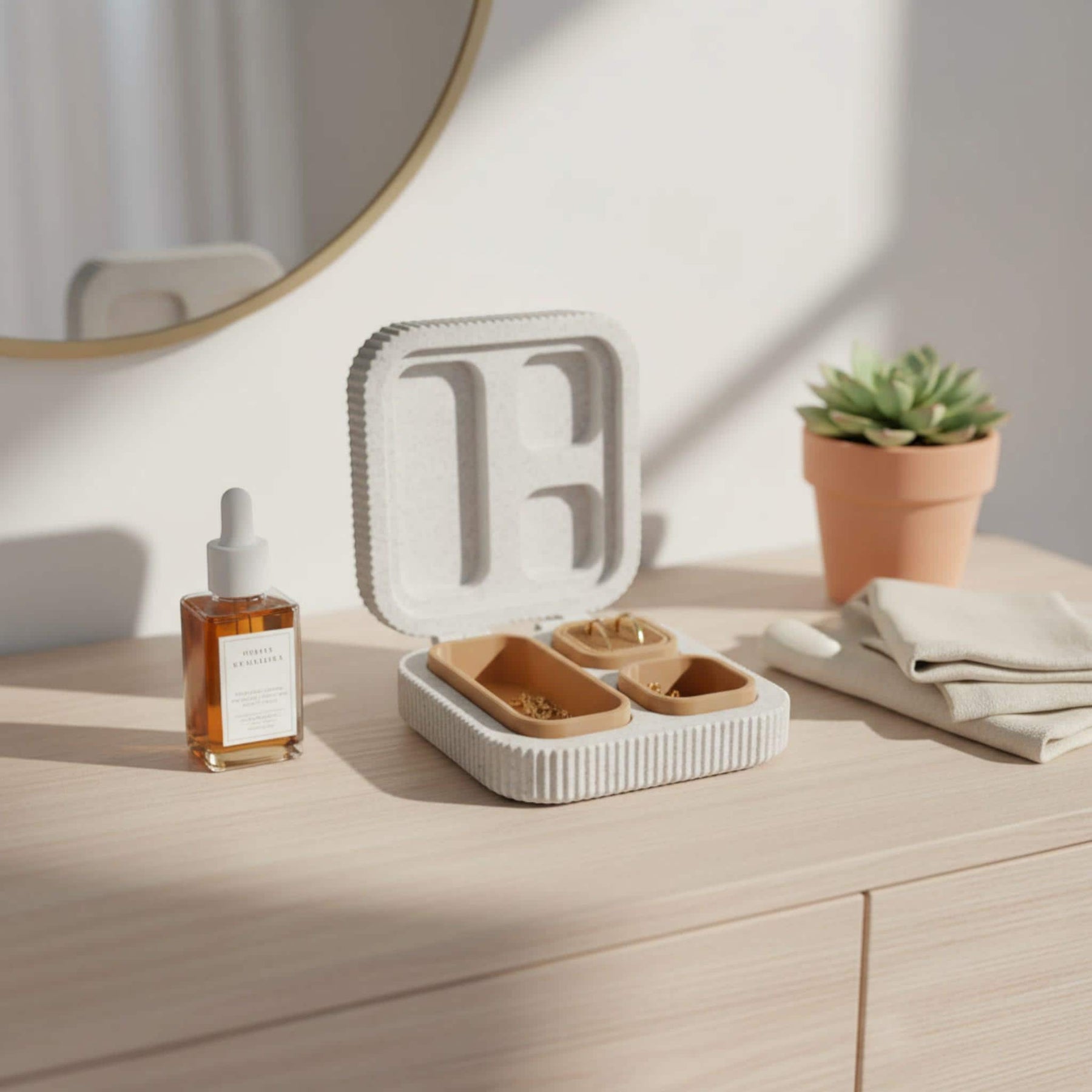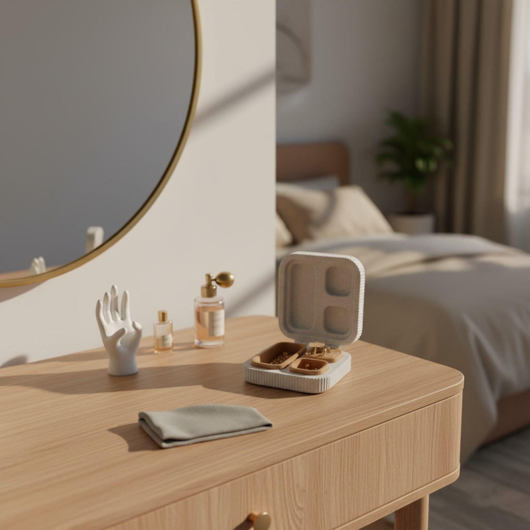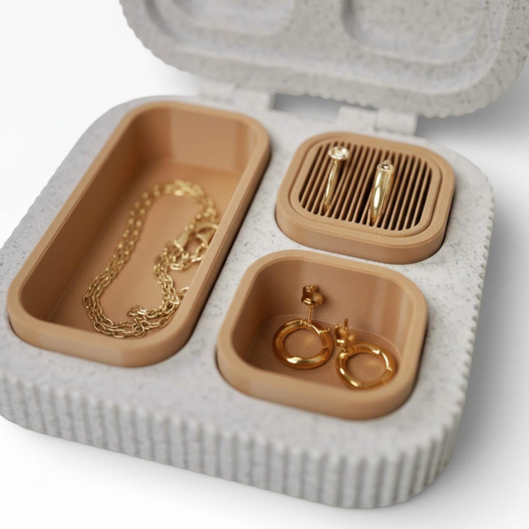 Smart Layout: Features dedicated sections for rings/earrings (ribbed insert) and an open tray for necklaces or bracelets.